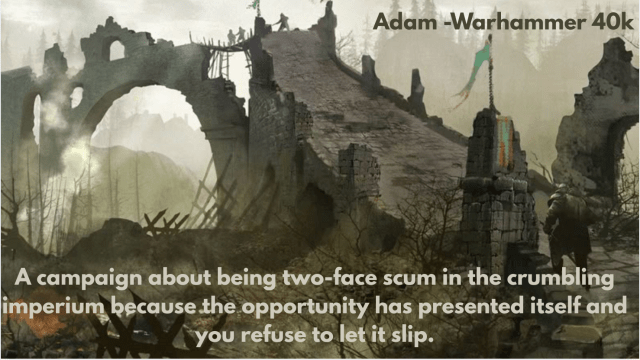 This campaign is set in the intimidatingly large and dark setting of Warhammer 40,000; however, I am going to try and keep things very grounded and easy to understand so you do not have to be in any way familiar with the setting.